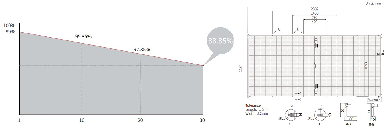 STC: AM1.5 1000W/m² 25°C NOCT: AM1.5 800W/m² 20°C 1m/s Incertidumbre de la prueba para Pmax: ±3%
